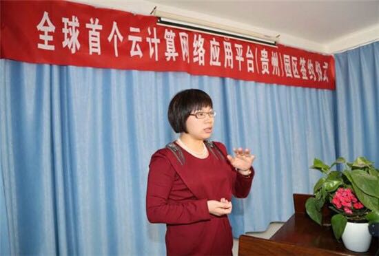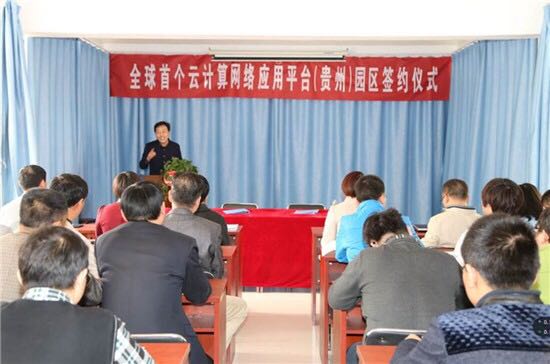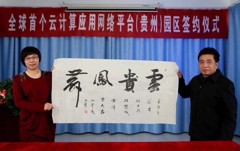 4月6日,贵州翔森投资置业有限公司董事长邓媛与北京鸿蒙网科技有限公司董事长郑世宝签订”全球首个云计算网络应用平台(贵州)园区”建设合作协议的情景。