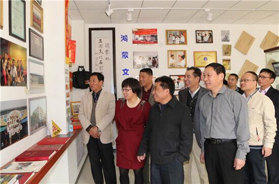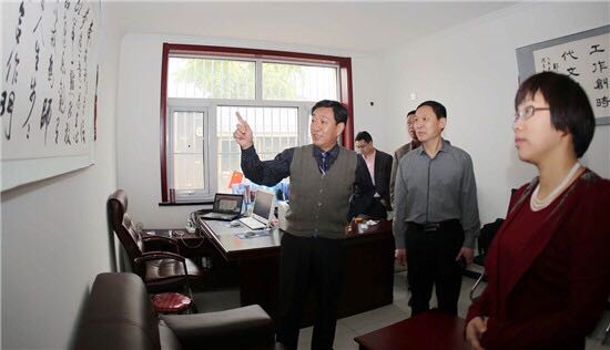 贵州翔森投资置业有限公司董事长邓媛一行在北京鸿蒙网科技有限公司董事长郑世宝的陪同下,在河北调研全球首个云平台项目展厅的情景。