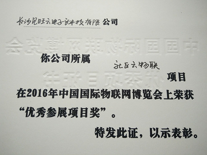 导航: 长沙见旺云电子科技有限公司 > > 最新公告 > 长沙见旺云电子科技有限公司获2016中国国际物联网博览会